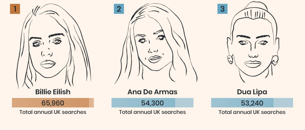Billie Eilish is the most searched celebrity in the UK for her beauty. Her confident self-expression and outer beauty make her one of the most searched and discussed celebrities of her generation.