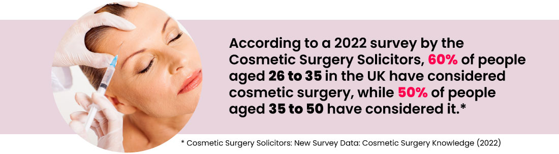 People at the age of 90 booked the least procedures, with just one blepharoplasty (eyelid surgery) booking made in the last six years. According to a 2022 survey by the Cosmetic Surgery Solicitors, 60% of people aged 26 to 35 in the UK have considered cosmetic surgery, while 50% of people aged 35 to 50 have considered it.